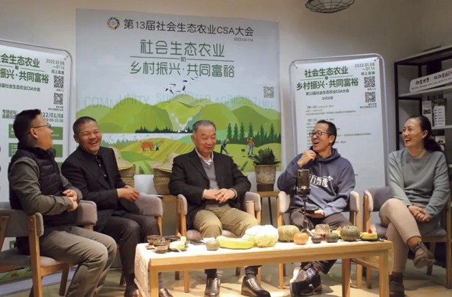 圖為丁立國(左二)參加社會生態(tài)農(nóng)業(yè)大會,會間交流。
