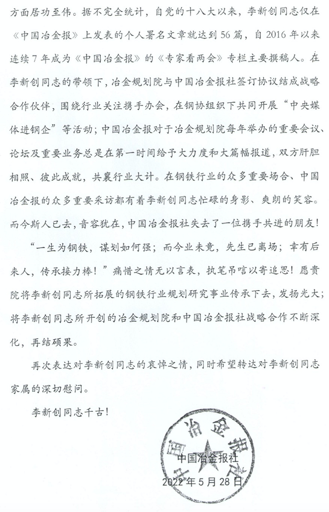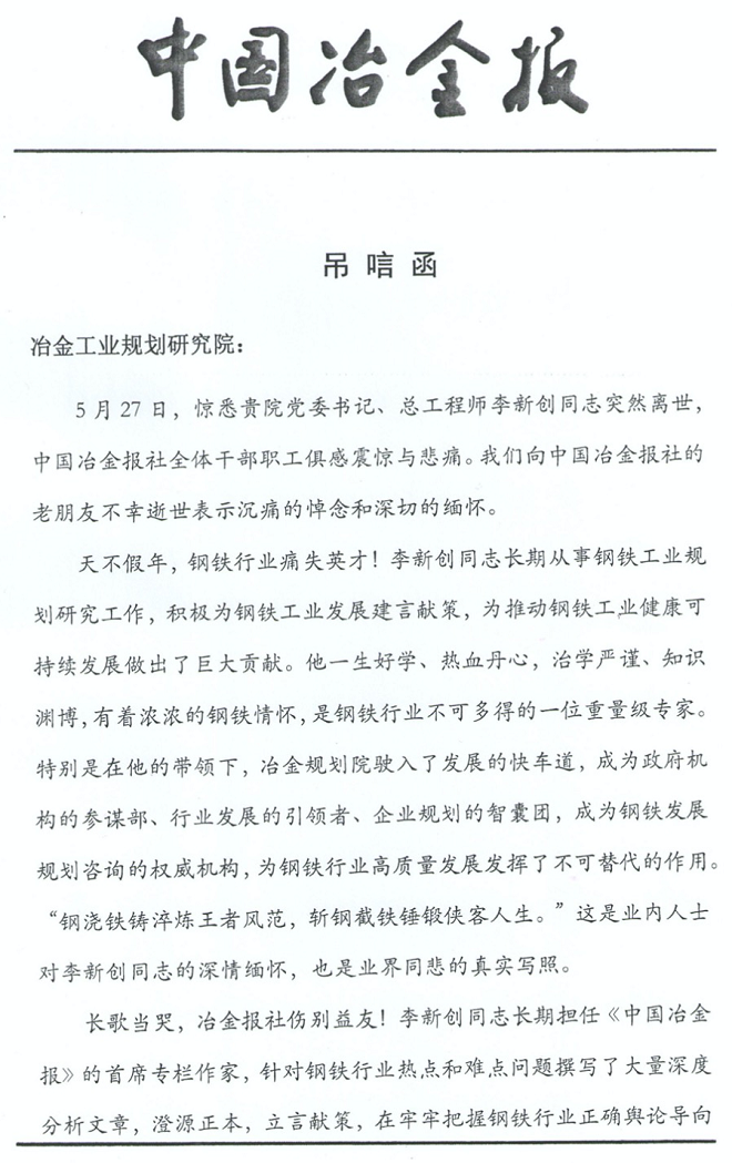 5月27日,冶金工業(yè)規(guī)劃研究院黨委書記、總工程師李新創(chuàng)同志突然離世,中國冶金報(bào)社全體干部職工俱感震驚與悲痛。我們向中國冶金報(bào)社的老朋友不幸逝世表示沉痛的悼念和深切的緬懷。