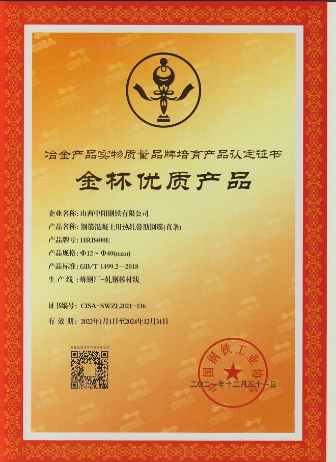 前段時間,中國鋼鐵工業(yè)協(xié)會發(fā)布了2021年冶金產(chǎn)品實物質(zhì)量品牌培育產(chǎn)品名單。中陽鋼鐵生產(chǎn)的鋼筋混凝土用熱軋帶肋鋼筋(直條)榜上有名,榮獲“金杯優(yōu)質(zhì)產(chǎn)品”榮譽,進一步擦亮了“中玉”品牌。這是中陽鋼鐵首次申報該殊榮。而能夠一舉獲得中國鋼鐵行業(yè)產(chǎn)品的“奧斯卡”獎,也充分證明了中陽鋼鐵產(chǎn)品質(zhì)量的可靠性。