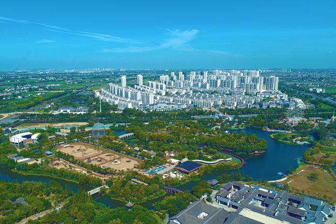 河西岸,江南農(nóng)耕文化主題公園內(nèi)翠色掩映,鳥雀成群,遠(yuǎn)處小橋流水,亭臺(tái)樓閣,與別具江南風(fēng)情的現(xiàn)代化農(nóng)民集中居住區(qū)構(gòu)成了一幅充滿詩(shī)意的畫卷。