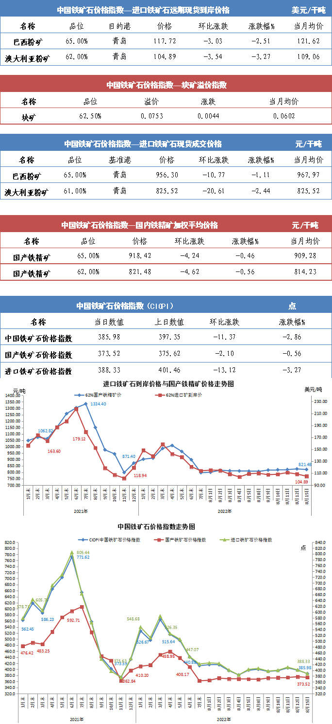 【行業指數】8月15日中國鐵礦石價格指數