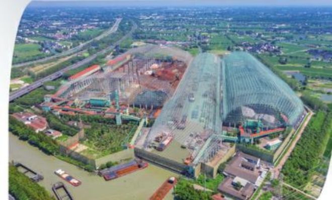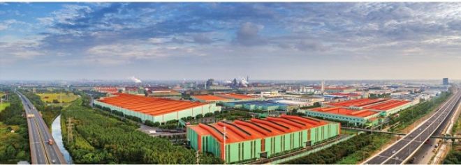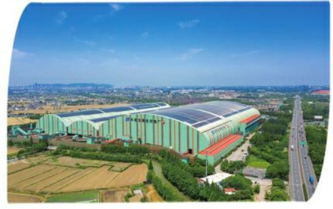 在從常熟市市區通往長江的高架橋途中,可以看到一大片墻體為綠色的廠房;聳立在廠區中間的高大煙囪以蔚藍色打底,上面繪著潔白的云朵;在廠房與廠房之間的空隙處,間或有樹冠探出屋面;在秋季明媚的陽光下,橘紅色的屋面熠熠生輝。