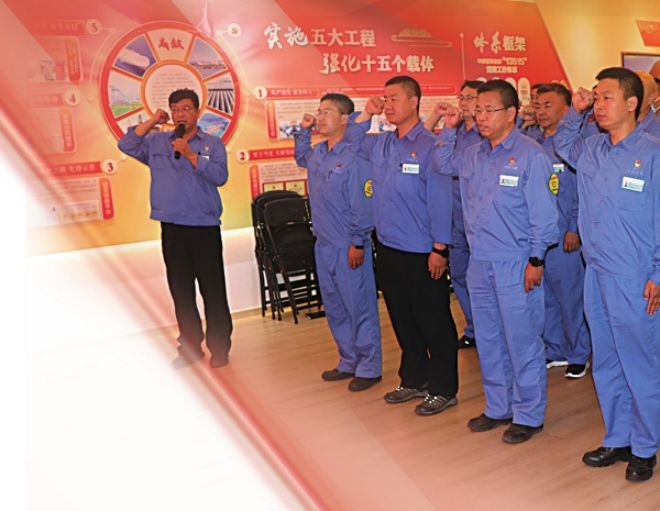 中厚板事業部開展微黨課宣講活動。圖為黨員們重溫入黨誓詞。(姜林憲 攝)