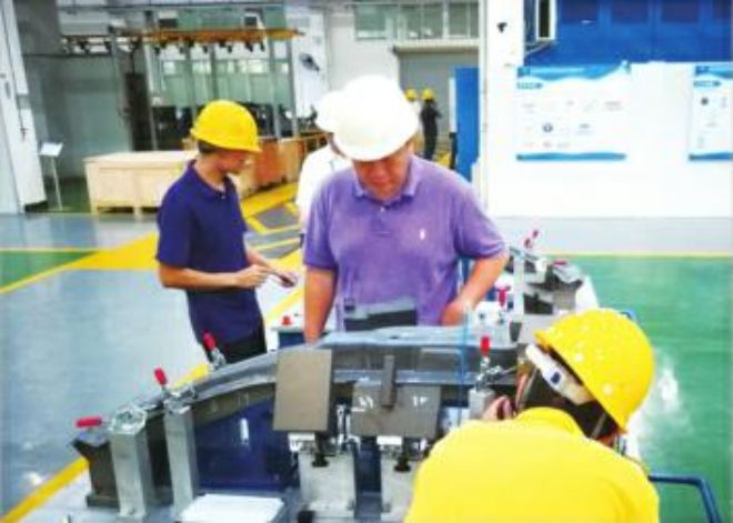 該團隊成員在中錳鋼溫成形汽車B柱試制現(xiàn)場