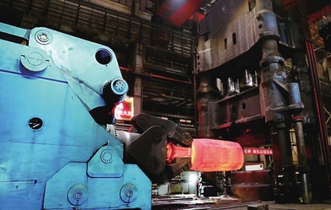 2018年底,3000kN/7500kNm大型鍛造操作機(jī)按期交付。在二重裝備車間,操作機(jī)穩(wěn)定夾持?jǐn)?shù)百噸1000℃以上高溫鍛坯進(jìn)行六維精準(zhǔn)送進(jìn),顯著提高了鍛造生產(chǎn)效率與材料利用率、減少了鍛造火次、降低了能耗,鍛件質(zhì)量也得以大幅提高。二重裝備有了3000kN/7500kNm大型鍛造操作機(jī)的助力,極限鍛造能力大大提升,開(kāi)創(chuàng)了高品質(zhì)鍛件綠色化、數(shù)字化、優(yōu)質(zhì)高效鍛造生產(chǎn)的新局面,形成了大型鍛件高端化、規(guī)模化、極限化制造的強(qiáng)大優(yōu)勢(shì)。2021年,二重裝備鍛造量突破8萬(wàn)噸,實(shí)現(xiàn)了核電主管道、超超臨界新產(chǎn)品項(xiàng)目鍛件、燃機(jī)項(xiàng)目轉(zhuǎn)子鍛件的“精品鍛造”,形成了以“華龍一號(hào)”為代表的第三代核電機(jī)型全套鑄鍛件、百萬(wàn)千瓦級(jí)超超臨界機(jī)組關(guān)鍵成套大鍛件等為代表的極限制造體系,譜寫了新時(shí)代大型鍛件生產(chǎn)新篇章。