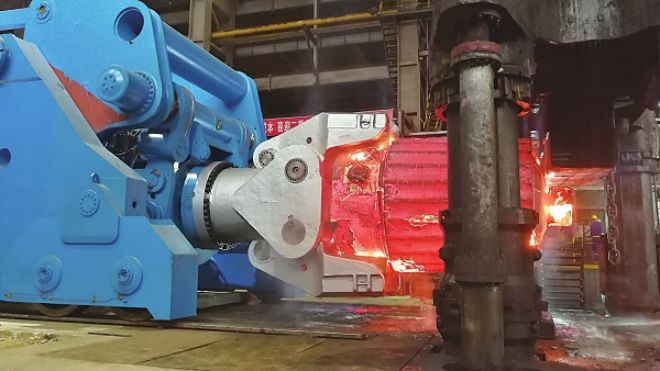 金秋時(shí)節(jié),走進(jìn)國(guó)機(jī)集團(tuán)國(guó)機(jī)重裝二重(德陽(yáng))重型裝備制造有限公司(以下簡(jiǎn)稱二重裝備)鑄鍛公司鍛造廠生產(chǎn)車間,一臺(tái)巨大的自動(dòng)化鍛造操作機(jī)首先映入眼簾,隨著這臺(tái)像小山丘一樣移動(dòng)的設(shè)備開(kāi)啟,它用強(qiáng)壯有力的鉗口夾持裝置穩(wěn)穩(wěn)地抓著幾百噸重的高溫鍛坯,靈活自如地進(jìn)行著提升、送進(jìn)、翻轉(zhuǎn)動(dòng)作。伴隨著萬(wàn)噸壓機(jī)錘頭有節(jié)奏地上下起落,截面形狀在滋滋聲中不斷發(fā)生著改變……“這就是3000kN/7500kNm鍛造操作機(jī),正在配合160MN水壓機(jī)進(jìn)行大型復(fù)雜鍛件生產(chǎn)的場(chǎng)景。”二重裝備鑄鍛公司黨委書記、副總經(jīng)理陳新倬通過(guò)視頻連線向參觀者邊展示、邊介紹。