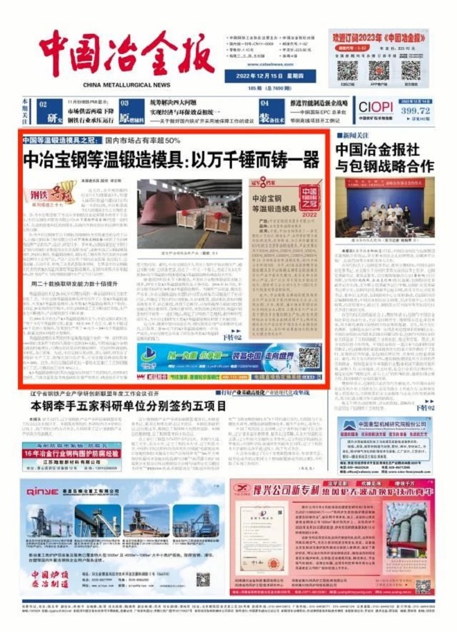從“苦干驚天動地事,甘做隱姓埋名人”的現場摸索與實踐,到“功成不必在我,功成必定有我”的大型K3等溫鍛造模具成功研發,中冶寶鋼鑄造技術團隊敢作敢當、腳踏實地,以萬千錘而鑄一器。