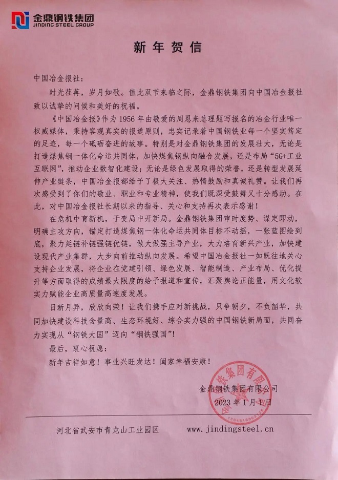 金鼎鋼鐵集團向中國冶金報社發(fā)來新年賀信