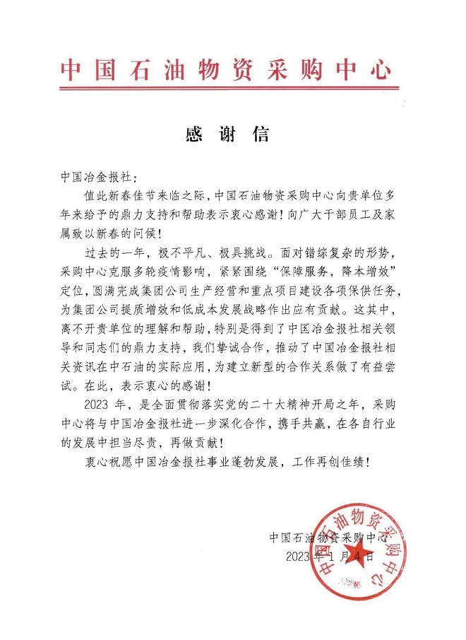 2023年1月4日,中國石油物資采購中心向中國冶金報社發來感謝信。感謝信中提到,過去的一年,面對錯綜復雜的形勢,中國石油物資采購中心克服多輪疫情影響,緊緊圍繞“保障服務,降本增效”定位,圓滿完成集團公司生產經營和重點項目建設各項保供任務,為集團公司提質增效和低成本發展戰略作出應有貢獻。這其中,離不開中國冶金報社的理解和幫助,特別是得到了中國冶金報社相關領導和同志們的鼎力支持,摯誠合作,推動了中國冶金報社相關資訊在中石油的實際應用,為建立新型的合作關系做了有益嘗試。2023 年,是全面貫徹落實黨的二十大精神開局之年,中國石油物資采購中心將與中國冶金報社進一步深化合作,攜手共贏,在各自行業的發展中擔當盡責,再做貢獻!
