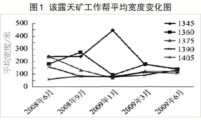 通過分析該露天礦山2008年—2009年1345米~1405米5個平臺平均寬度數據可以看出:2008年6月份—2009年6月份,這5個平臺平均寬度大致呈下降趨勢。2008年6月份,1405米以上平臺已經剝離并且并幫處理,但1405米以下工作幫平臺寬度較為適宜,而且工作線較為規整,便于平盤生產設備效率正常發揮。但由于征地工作未能及時到位,隨著生產推進,至2009年1月份,1345米平臺寬度大幅上升,平均寬度達到400米以上,而1360米~1405米工作平臺寬度大幅下降,下降至100米以下,其中平臺寬度最窄處僅35米,使得平盤推進面變得十分不規則。