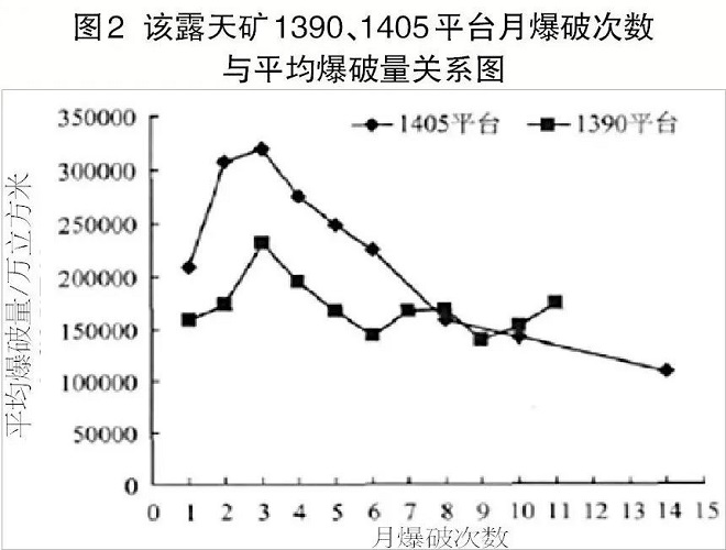 圖2為該露天礦1390米、1405米平臺2005年—2009年爆破次數與平均爆破量關系圖。對于1390米和1405米平臺,當月爆破次數為3次時,平均爆破量最高,而隨著月爆破次數的增加,平均爆破量減少,且隨著標高的提升,該趨勢更為明顯。
