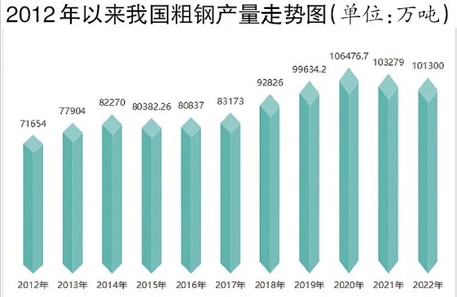 2023年,鋼鐵行業將繼續推進產能置換、超低排放改造、極致能效三大鋼鐵改造工程,以及“基石計劃”和以推廣鋼結構住宅為主攻方向的鋼鐵應用拓展計劃兩大產業發展計劃。隨著鋼鐵行業能效標桿三年行動方案啟動,極致能效工程進入實質性實施階段。筆者預計,2023年,我國粗鋼產量將降至10.1億噸左右。