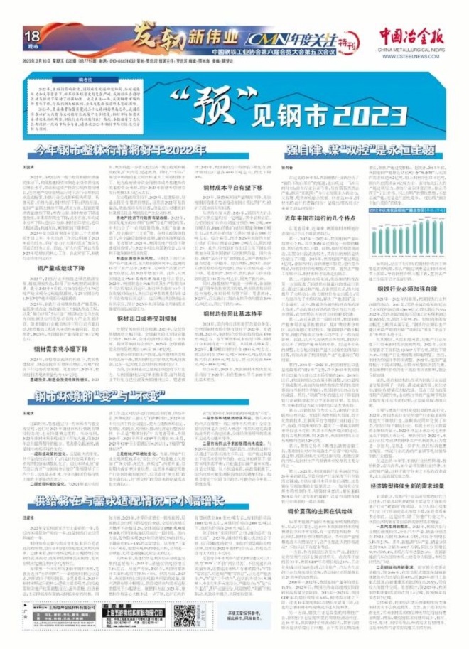 綜合來看,2023年,我國鋼材市場供需關系將好于2022年,鋼價整體水平與2022年相比基本相當。
