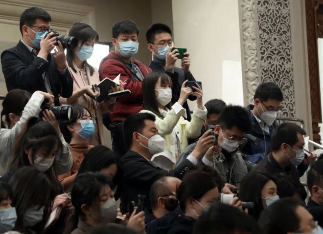 3月12日,第十四屆全國人民代表大會第一次會議第五次全體會議前,第三場“代表通道”開啟。盡管離“代表通道”開啟還有一段時間,但記者們已經早早站上了會場準備的階梯,布置好了各類“長槍短炮”、帶有媒體標識的話筒,還有一些記者已經在做視頻播報。