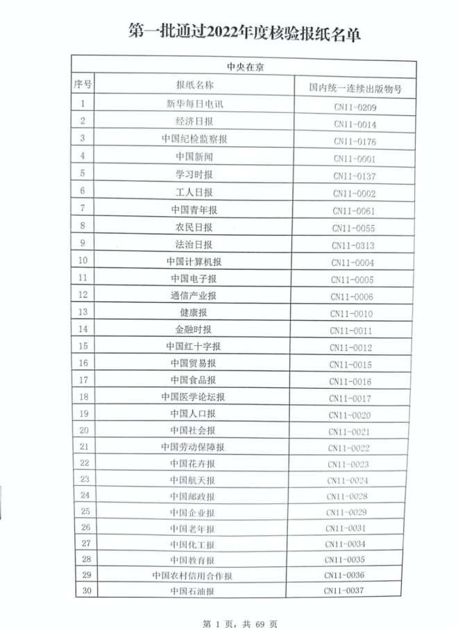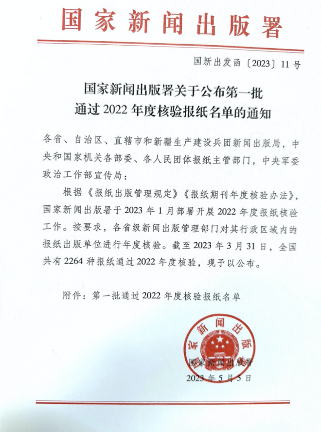 根據(jù)《報(bào)紙出版管理規(guī)定》、《報(bào)紙期刊年度核驗(yàn)辦法》,國(guó)家新聞出版署于2023年1月部署開(kāi)展2022年度報(bào)紙核驗(yàn)工作。按要求,各省級(jí)新聞出版管理部門(mén)對(duì)其行政區(qū)域內(nèi)的報(bào)紙出版單位進(jìn)行年度核驗(yàn),核驗(yàn)開(kāi)展的時(shí)間段為2023年2月10日—3月31日。截至2023年3月31日,全國(guó)共有2264種報(bào)紙通過(guò)2022年度核驗(yàn)。