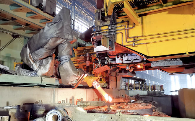 在生產車間,通過“智慧”賦能,中南股份實施了諸多智能制造創新項目。如連鑄大包自動澆鋼項目采用激光與雙目視覺識別技術,實現精準定位,讓機器人替代員工完成大包滑板油缸、長水口裝拆、燒氧引流、中包測溫取樣、添加保溫覆蓋劑等操作,在行業內首次實現“大方坯連鑄自動澆鋼”,既提升了產品精度,又降低了員工勞動強度。