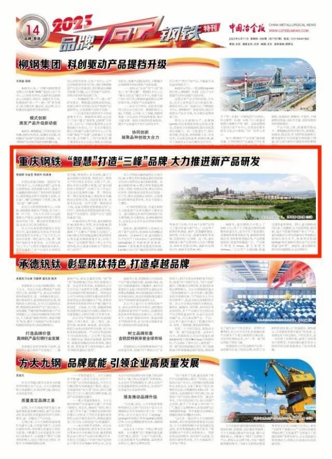 2022年,重慶鋼鐵共計投入了5300萬元用于大力推進品種結構調整和質量攻關。成功開發了低屈強比高強韌性橋梁用鋼系列、耐候橋梁用鋼系列、美標橋梁用鋼系列,產品的強度級別、質量等級覆蓋廣泛。產品最大厚度80mm,最大寬度3600mm,產品廣泛應用于交通運輸、軌道交通等重要領域,如重慶鵝公巖大橋、云南龍江特大橋、廣州丫髻沙大橋等重點工程項目。同時成功打造了高建鋼、壓力容器用管、耐蝕鋼、海洋與船舶用鋼的“拳頭”產品。重慶鋼鐵自主研發的耐蝕中厚鋼板達到國內領先水平,橋梁用結構鋼Q345qD榮獲2022年度冶金產品實物質量“金杯獎”。2022年獲得中國卓越鋼鐵企業品牌稱號。