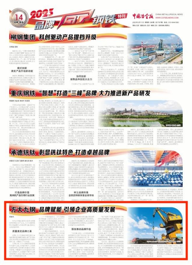 從當(dāng)初最普通的建筑鋼筋到現(xiàn)在的鐵標(biāo)鋼、容器鋼、高層建筑用鋼等,方大九鋼通過提高產(chǎn)品質(zhì)量、提升品牌影響力,不斷做大“博升”品牌旗下產(chǎn)品,助推企業(yè)品牌升級,為客戶提供最滿意的服務(wù),與湖北交投物流集團(tuán)等多家企業(yè)簽訂戰(zhàn)略合作協(xié)議,榮獲“全國優(yōu)質(zhì)建筑用鋼品牌工藝質(zhì)量獎”以及“全國用戶滿意企業(yè)”“全國重大工程建設(shè)榜樣”等榮譽稱號,企業(yè)高質(zhì)量發(fā)展再增動力,助推企業(yè)加速邁向高質(zhì)量發(fā)展。(吳益凡)