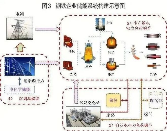 該企業將儲能系統分布式植入鋼鐵工藝流程中,減少了設備投資,增大了儲能容量,促進了新能源發電與鋼鐵的進一步結合。在儲能效率85%、電網電價0.6元/千瓦時的情況下,該企業儲能系統年收益9000萬元,靜態投資回收期僅4.5年,經濟可行性良好。圖3為鋼鐵企業儲能系統構建示意圖。