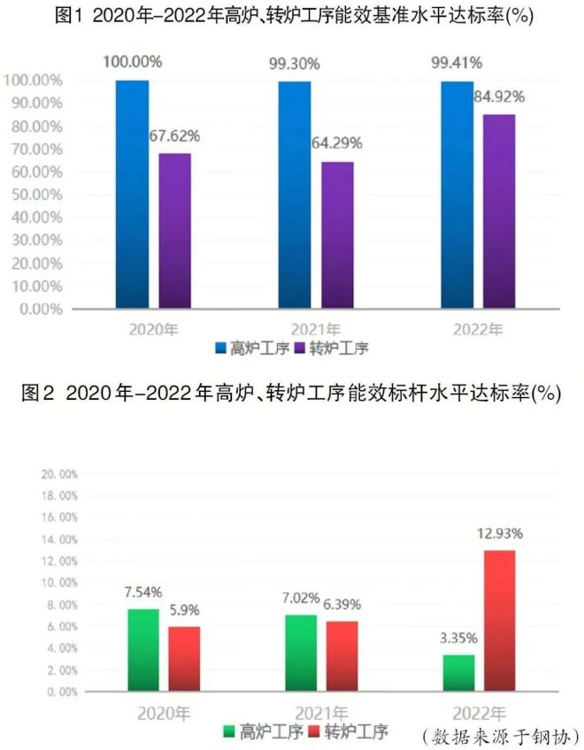中國鋼鐵工業(yè)協(xié)會數(shù)據(jù)顯示,2020年—2022年,高爐工序達到能效基準值的產量占比分別為100%、99.3%、99.41%,達到能效標桿值的比例分別為7.54%、7.02%、3.35%;轉爐工序達到能效基準值的產量占比分別為67.62%、64.29%、84.92%,達到能效標桿值的比例分別為5.9%、6.39%、12.93%。可見,鋼鐵行業(yè)高爐工序達到能效基準值的產量占比均在99%以上,遠高于轉爐工序,但整體而言,各主體工序達到能效標桿值的比例,距“2025年能效達到標桿值的產能占比超30%”的政策要求有較大差距。由于高爐經濟爐料使用比例上升、節(jié)能技術創(chuàng)新不夠、精細化系統(tǒng)節(jié)能意識不足、工序能耗統(tǒng)計口徑存在差異等原因,推進主體工序能耗達標工作遇到一定挑戰(zhàn)。