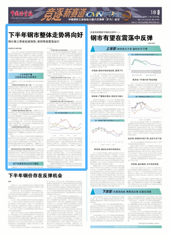 “如果今年繼續執行粗鋼產量壓減政策,那么下半年國內粗鋼產量將被動減少。同時,由于鋼材社會庫存已降至低位,供給端缺乏彈性,一旦下半年需求加快釋放,市場極有可能上演供需錯配行情,屆時,鋼材價格有望出現階段性拉漲。”他進一步表示,綜合來看,今年下半年,鋼材市場總體將向好,鋼材價格有望在第三季度進一步上漲,在第四季度震蕩運行。同時,成材價格漲幅有望大于原燃料價格漲幅,鋼企利潤將進一步修復。