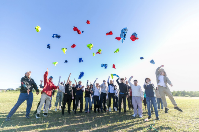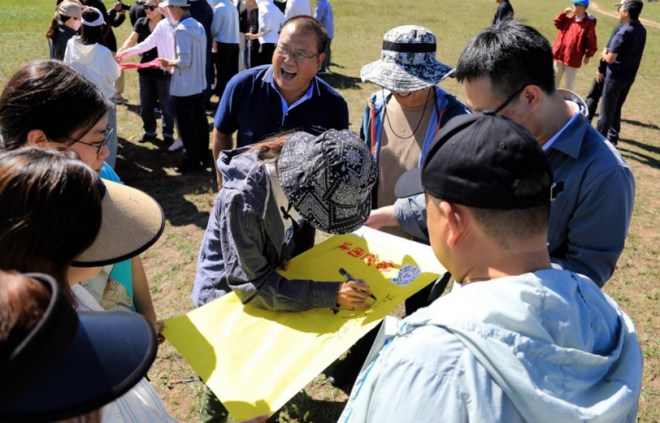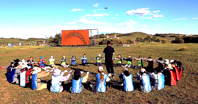 在拓展活動的最后,大家圍坐在草坪上,手中握著同一條繩索,每個人盡全力才能拉成一個標準的圓。大家拉緊繩索,揮舞雙臂上—左—下—右旋轉,感受彼此支撐的團結力量。正如一代又一代護林人所傳達的塞罕壩精神,只有艱苦奮斗、甘于奉獻、團結一致,才能讓黃沙遮天的茫茫荒原變為如今林的海洋。