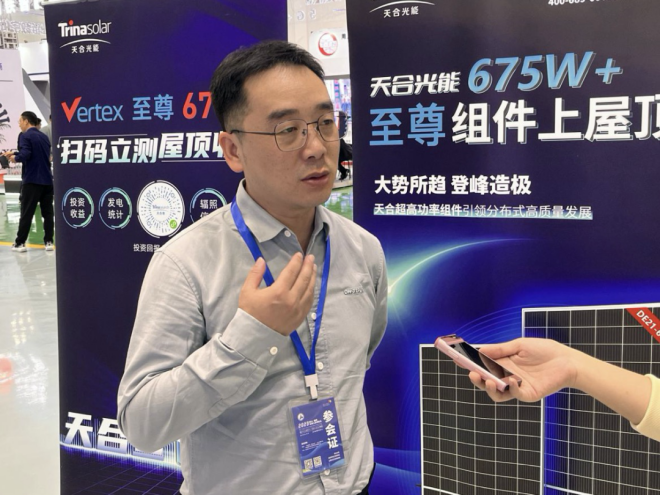 河鋼供應鏈資源關系中心部長楊世廣、天合光能中國區分銷解決方案經理沙國超在會議間隙接受本報記者采訪。