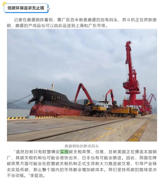 鼎盛下游很多用戶的生產(chǎn)基地在中國,但是產(chǎn)成品很多出口國外。“歐洲的鋼鐵用戶,目前在全球范圍內(nèi)尋找低碳綠鋼, 由于歐盟的碳關(guān)稅機制,很多客戶愿意支付綠色低碳的溢價。”李挺說。