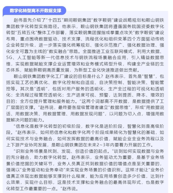 會(huì)上,鞍山鋼鐵集團(tuán)有限公司數(shù)智發(fā)展部副總經(jīng)理趙偉作了題為《數(shù)據(jù)驅(qū)動(dòng)鋼鐵流程數(shù)字化轉(zhuǎn)型思考》的主旨報(bào)告。他表示,要建立數(shù)據(jù)驅(qū)動(dòng)、技術(shù)支撐、流程優(yōu)化、組織變革的發(fā)展體系,打造數(shù)據(jù)驅(qū)動(dòng)的數(shù)字化轉(zhuǎn)型新模式,加快業(yè)務(wù)模式和管理體系變革,由業(yè)務(wù)數(shù)字化向數(shù)字業(yè)務(wù)化創(chuàng)新轉(zhuǎn)型,形成數(shù)字化企業(yè)新生態(tài)體系。