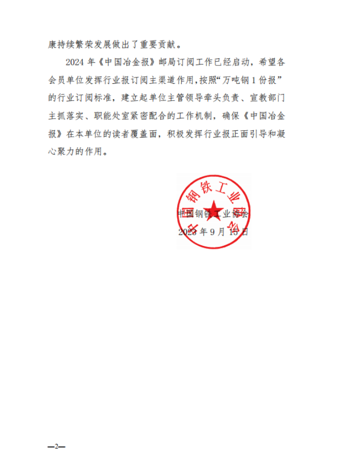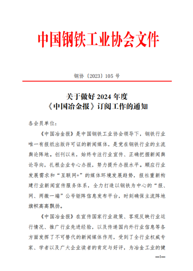 《中國冶金報》是中國鋼鐵工業(yè)協(xié)會領(lǐng)導(dǎo)下,鋼鐵行業(yè)唯一有報紙出版許可證的權(quán)威新聞媒體,是黨在鋼鐵行業(yè)的主流輿論陣地。1956年創(chuàng)刊以來,始終專注行業(yè)宣傳,正確把握新聞輿論導(dǎo)向,扎根企業(yè)專心辦報,努力提升辦報水平。2024年度《中國冶金報》郵局訂閱工作正式啟動,中國鋼鐵工業(yè)協(xié)會以鋼協(xié)【2023(105號)】“關(guān)于做好2024年度《中國冶金報》訂閱工作通知”已下發(fā)。希望全國鋼鐵企業(yè)紀檢監(jiān)察系統(tǒng)各級部門發(fā)揮渠道作用,在積極組織向?qū)谔峁﹥?yōu)質(zhì)稿件的同時,集團公司紀委主管領(lǐng)導(dǎo)牽頭負責、機關(guān)黨支部紀檢委員,二級單位紀檢組織負責人緊密配合的工作機制,力爭做到全國鋼鐵企業(yè)紀檢監(jiān)察系統(tǒng)各級干部“人手一份”報紙,確保《中國冶金報》在本單位紀檢監(jiān)察系統(tǒng)的讀者覆蓋面。