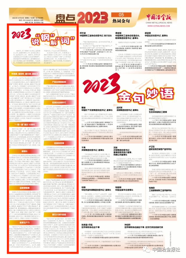 在此辭舊迎新之時,《中國冶金報》精選了2023年鋼鐵行業(yè)熱議的十大年度關鍵詞,并借由幾位鋼鐵“大咖”之口帶領讀者回顧過去的一年,為2023年畫上一個圓滿的句點,并敲下回車鍵,開啟2024年的全新章節(jié)。