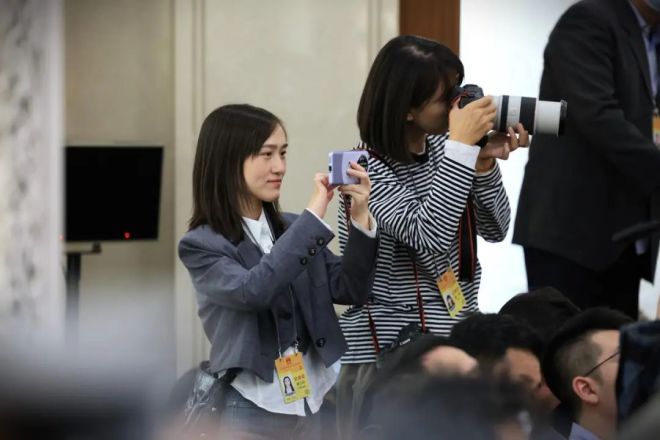 中國冶金報社兩會報道組記者樊三彩在現場用手機錄制小視頻報道