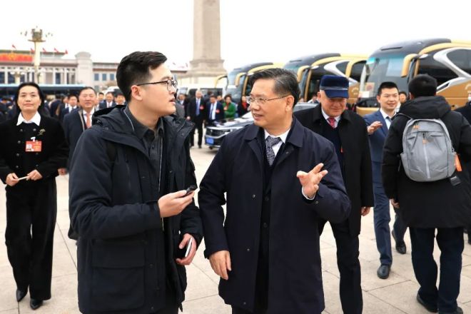 圖為胡望明在步入會場前與中國冶金報(bào)社兩會報(bào)道組記者對話交流