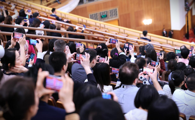 坐在記者席的記者們紛紛用手機(jī)拍攝記錄大會(huì)盛況