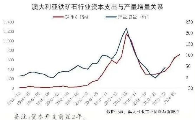 鐵礦石供給端即將進入繁榮期。上圖是根據澳大利亞工業科學資源部相關數據整理的鐵礦石行業資本開支與鐵礦石產量增量變化相關性圖(1990年—2023年)??梢钥吹剑Y本開支平均領先鐵礦石產量增量2.5年。在經歷了2016年—2019年的低速增長后,2020年開始,相關的資本開支重新進入到擴張階段,按照2年~3年的領先性,未來鐵礦石產量的釋放不可避免。該部門甚至預計,到2029年,澳大利亞的鐵礦石出口量預計將達到9.83億噸。