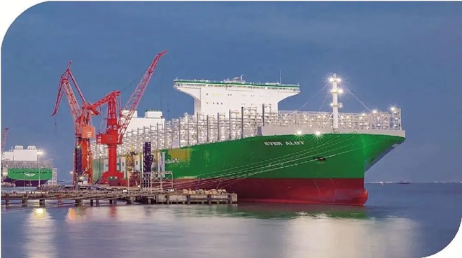 圖為使用鞍鋼船板制造的大型集裝箱船。