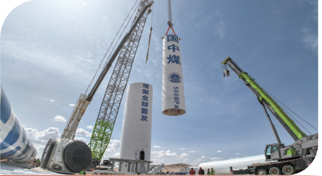 圖為4月21日,在新疆哈密戈壁灘上,全球首臺(tái)套500兆帕高強(qiáng)鋼風(fēng)電塔架吊裝現(xiàn)場(chǎng)。