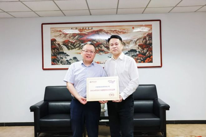 圖為范鐵軍向李明坦頒發中國冶金報社評選的中新鋼鐵2024中國卓越鋼鐵企業品牌獎牌