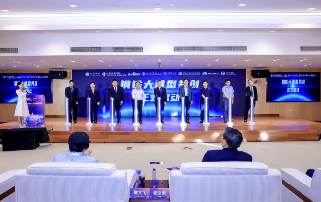 圖為由中信泰富特鋼、南鋼集團(tuán)、中信數(shù)科、深圳計(jì)算機(jī)科學(xué)研究院、清華大學(xué)、北京科技大學(xué)、華為、百度聯(lián)手的鋼鐵大模型共創(chuàng)啟動(dòng)