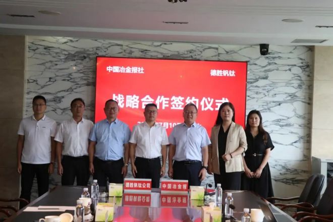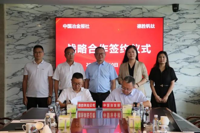 7月10日,中國冶金報社與四川德勝集團釩鈦有限公司(以下簡稱德勝釩鈦)在四川樂山簽訂戰略合作協議。德勝釩鈦董事長、總經理周平與中國冶金報社黨委書記、社長范鐵軍代表雙方簽約。德勝釩鈦副總經理徐瑜,總經理助理冉頂立,行政部長楊磊,黨群工作部副部長肖迪;中國冶金報社社長助理兼經濟發展中心主任、卓越品牌促進中心主任陳曉莉參加簽約儀式。雙方圍繞鋼鐵行業運行趨勢、釩鈦產業發展、區域協同等進行深入交流。根據協議,雙方將在品牌塑造、產品宣傳、技術引進、宣傳片制作、信息咨詢等方面進行深入全面合作。