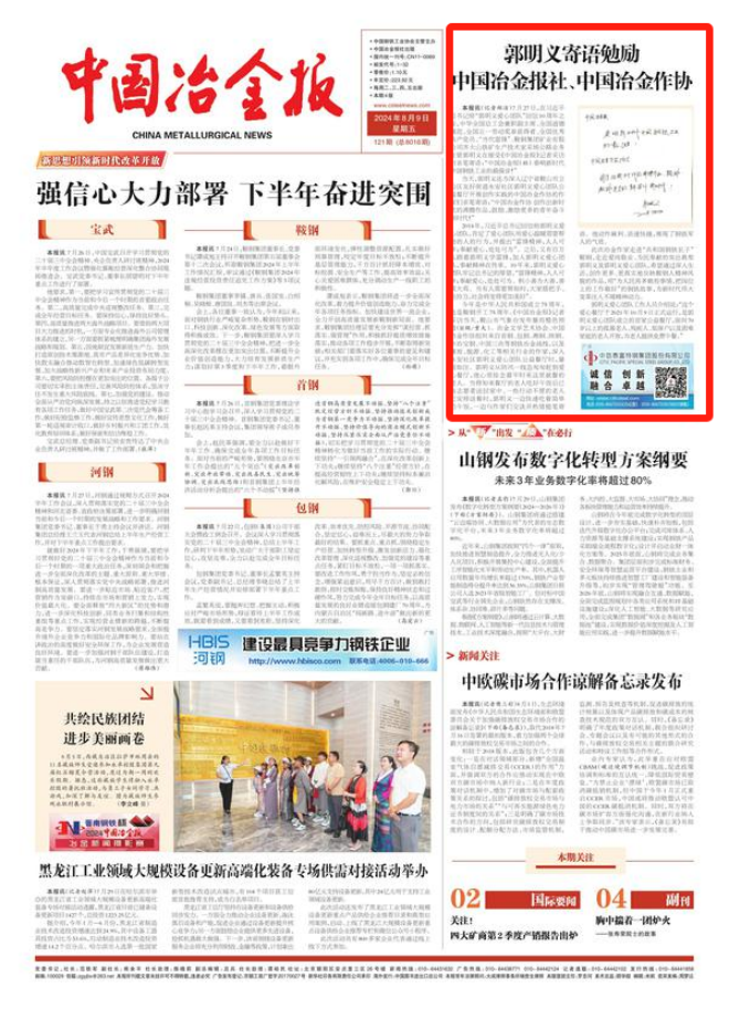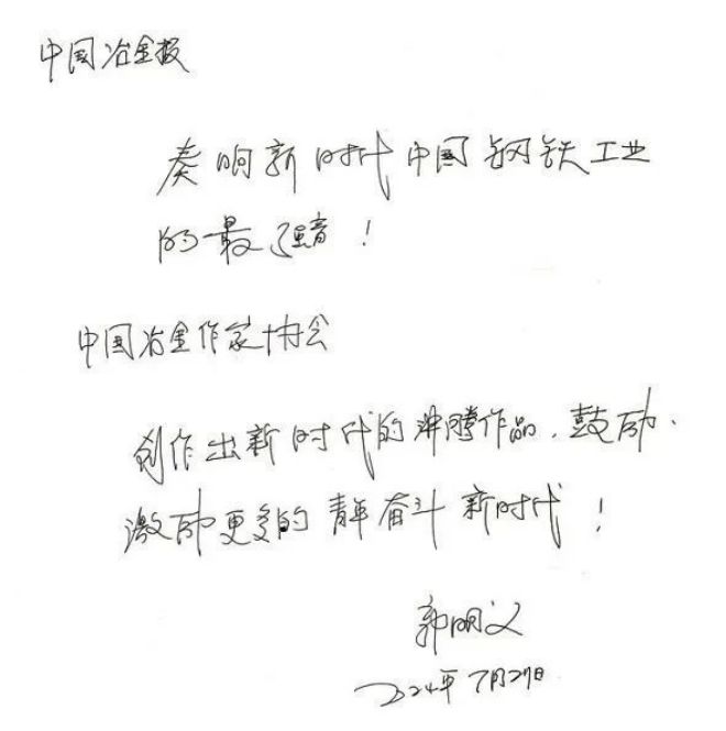 7月27日,在習近平總書記給“郭明義愛心團隊”回信10周年之際,中華全國總工會兼職副主席、全國道德模范、全國五一勞動獎章獲得者、全國優秀共產黨員、“當代雷鋒”、鞍鋼集團礦業有限公司齊大山鐵礦生產技術室采場公路業務主管郭明義在接受《中國冶金報》記者采訪時親筆寄語:“中國冶金報(社)奏響新時代中國鋼鐵工業的最強音!”