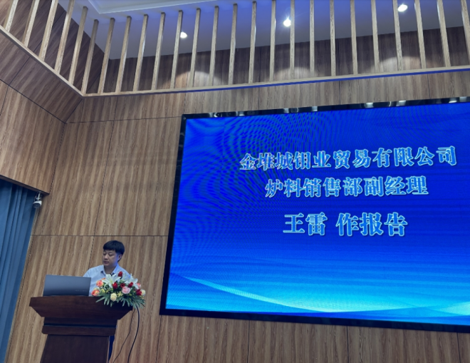 圖為金堆城鉬業貿易有限公司爐料銷售部副經理王雷做報告 (溫曉霞 攝影)