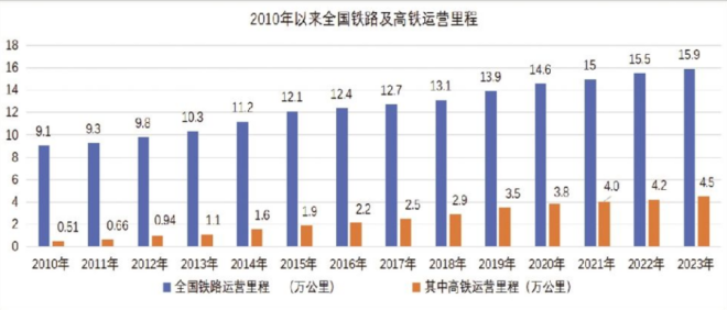 根據《“十四五”現代綜合交通運輸體系發展規劃》,到2025年,全國鐵路運營里程將達到16.5萬公里,其中高鐵里程達到5萬公里。截至2023年底,全國鐵路運營里程達到15.9萬公里,其中高鐵達到4.5萬公里。要想實現“十四五”鐵路發展目標,今明兩年投入運營的鐵路里程在6000公里左右,明年估計迎來一個鐵路新線投產小高峰,鋼軌需求也會有所增加,但總體平穩。