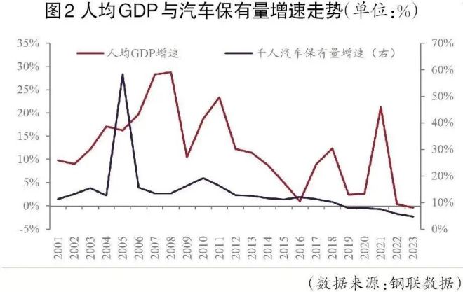 汽車消費與居民收入有直接關系。在過去20年里,汽車保有量隨著人均GDP的增長而增加(如圖2)。在21世紀的前10年,我國汽車保有量增速與人均GDP增速均維持較高水平。2011年以來,人均GDP增速放緩,汽車保有量增速也明顯下降。2021年—2023年,人均GDP年均增速為7.1%,千人汽車保有量年均增速為6%。假設2024年—2030年我國人均GDP增速為4%,那么,汽車保有量增速約在2%~3%。