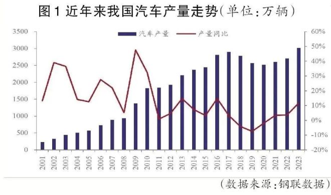 21世紀初,隨著我國經濟飛速發展,汽車行業迎來繁榮期。2001年—2010年,我國汽車產量年均增速高達25%。經過多年來的發展,我國汽車行業已邁入成熟期,汽車產銷量增速有所下滑。2011年以來,我國汽車產銷量增速明顯放緩。2011年—2023年,我國汽車產量年均增速降至4%。其中,2018年—2020年,受汽車購置稅減半政策退坡和新冠疫情的影響,我國汽車產量呈現負增長(如圖1)。