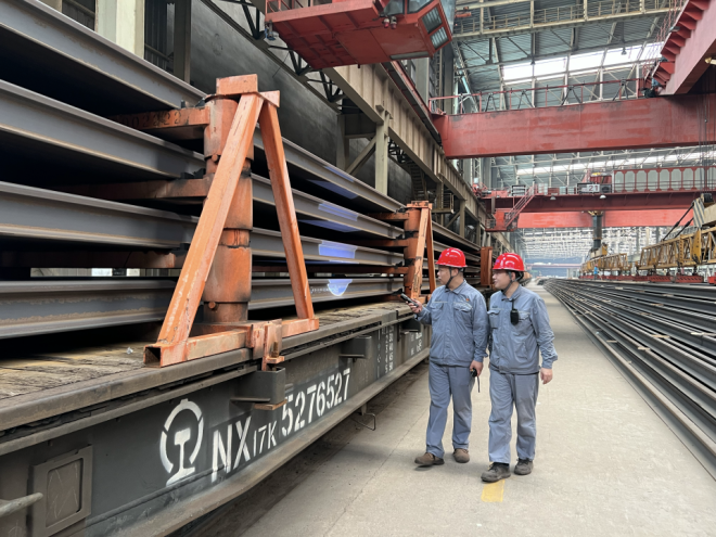 圖為邯鋼大型軋鋼廠職工正在認真檢查即將發運的重軌固定情況。李嬌 攝