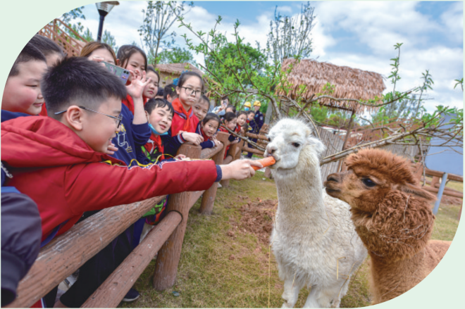 圖為2021年4月9日江西省萍鄉市高豐小學的180余名師生來到方大萍 安鋼鐵進行研學之旅,小學生們正在給羊駝喂食。(特約通訊員 張韶濱 攝)