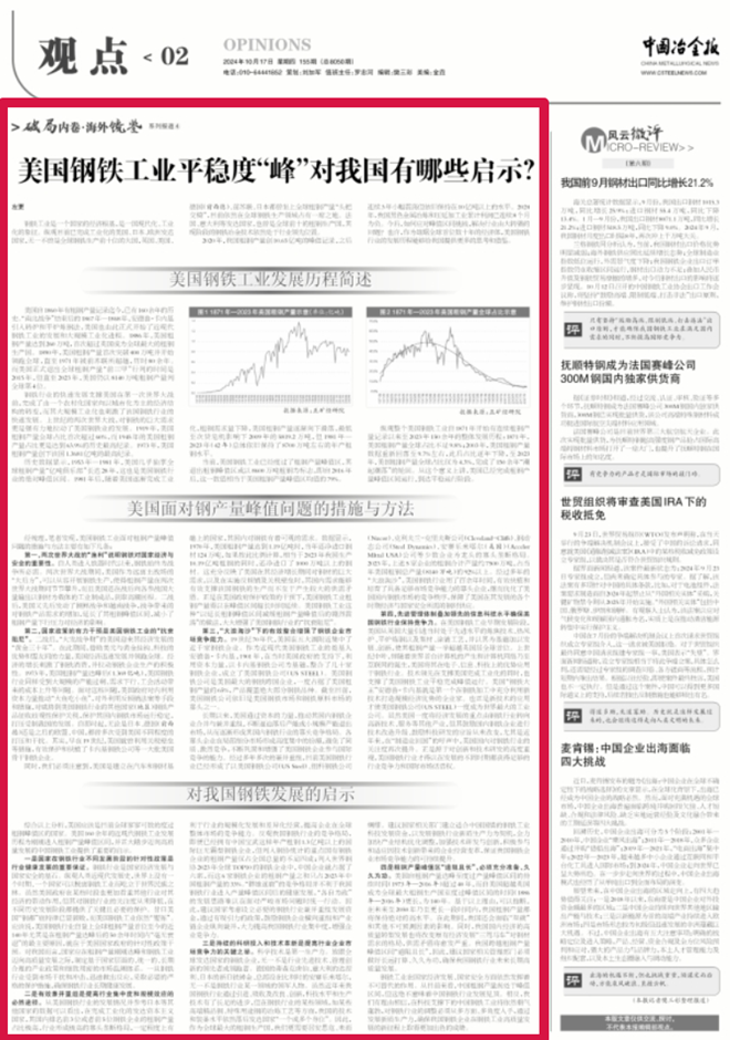 2020年,我國(guó)粗鋼產(chǎn)量創(chuàng)10.65億噸的峰值記錄,之后連續(xù)3年小幅震蕩但依舊保持在10億噸以上的水平。2024年,我國(guó)黑色金屬冶煉和壓延加工業(yè)累計(jì)利潤(rùn)已連續(xù)8個(gè)月為負(fù)。今后,如何應(yīng)對(duì)峰值區(qū)間挑戰(zhàn),解決行業(yè)由大轉(zhuǎn)強(qiáng)的問題?也許,作為雄踞全球首位數(shù)十年的經(jīng)濟(jì)體,美國(guó)鋼鐵行業(yè)的發(fā)展歷程能夠給我國(guó)提供更多的思考和借鑒。