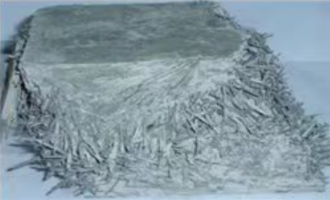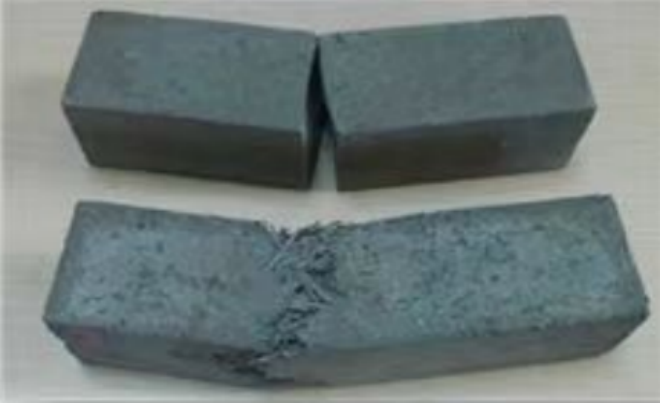 爐腹爐腰預掛渣皮技術(shù)是將金屬陶瓷材料澆注于冷卻壁表面,在冷卻壁表面形成一層永久性的人造渣皮保護層。該材料將金屬纖維引入到非金屬澆注料中,將兩者的優(yōu)點相結(jié)合,提高材料的抗折抗壓等物理指標,提高材料的導熱能力,延長爐腹、爐腰區(qū)域耐材的使用壽命。在350℃條件下,導熱系數(shù)20W/(K·m)左右;鋼纖維含量達到40%左右,不是普通的高鋼纖維澆注料(10%以下),其200℃以下抗折強度可達到35MPa~40MPa,在實驗室常規(guī)抗折檢測設備都無法將其壓彎,而折后的材料也不“折而不斷”。下圖為預掛渣皮材料的物理檢測圖。