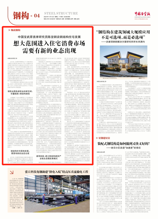 不過,即使如此,鋼結構住宅的占比仍很低,這是什么原因造成的?如何有效推動發展?近日,《中國冶金報》記者專訪了中國寶武原首席研究員陳堅鋼。